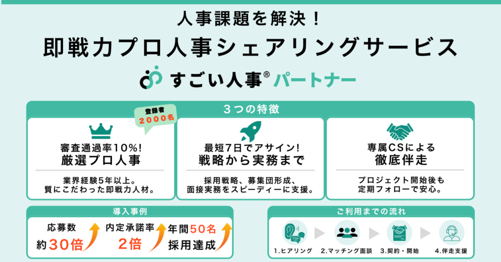 「すごい人事パートナー」に登録している人材は、専門性の高い人事のプロばかりですから安心です。採用分野を前面に押し出していますが、採用以外の人事領域に関する業務もおおむね対応可能です。